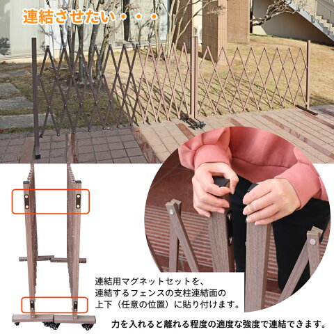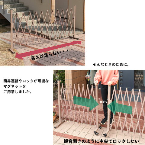 フラットな場面で便利なキャスター脚と、土の地面にペグ打ちできる固定脚の組み合わせが選べ、駐車場入り口の簡易ロックや、幅広で使用したいときの連結ができるマグネットパーツもご用意していますので、開閉と間仕切りが必要なあらゆる場面で活躍します。