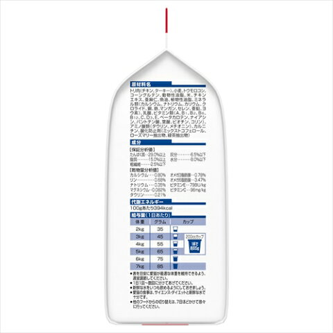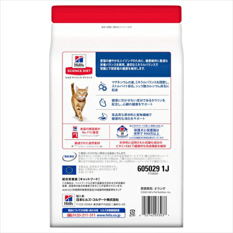 高齢猫の免疫力、心臓、腎臓の健康をサポート高齢猫の免疫力、心臓、腎臓の健康をサポート ・マグネシウムの量、ミネラルバランスを調整し、ストルバイト尿石、シュウ酸カルシウム尿石に配慮 ・健康に欠かせない成分であるタウリンを配合し、心臓の健康をサポート ・高品質な原材料と食物繊維で健康的な消化をサポート ・ビタミンEとオメガ3&6脂肪酸を含み、健康な皮膚と美しい被毛をサポート原材料(成分):トリ肉(チキン、ターキー)、小麦、トウモロコシ、コーングルテン、動物性油脂、米、チキンエキス、亜麻仁、魚油、植物性油脂、ミネラル類(カルシウム、ナトリウム、カリウム、クロライド、銅、鉄、マンガン、セレン、亜鉛、ヨウ素)、乳酸、ビタミン類(A、B1、B2、B6、B12、C、D3、E、ベータカロテン、ナイアシン、パントテン酸、葉酸、ビオチン、コリン)、アミノ酸類(タウリン、メチオニン)、カルニチン、酸化防止剤(ミックストコフェロール、ローズマリー抽出物、緑茶抽出物)保証成分:たんぱく質29.0%以上、脂質15.0%以上、粗繊維2.5%以下、灰分6.5%以下、水分8.0%以下、カルシウム0.80%、リン0.68%、ナトリウム0.35%、マグネシウム0.082%、タウリン0.21%、オメガ3脂肪酸0.78%、オメガ6脂肪酸3.47%、ビタミンE:798IU/kg、ビタミンC:96mg/kgエネルギー:394kcal/100g給与方法:【1日当たりの給与量目安】 体重2kg:35g、体重3kg:45g、体重4kg:55g、体重5kg:65g、体重6kg:75g、体重7kg:85g ※200ccカップ1杯で約85g ・上記を目安に愛猫が最適な体重を維持できるよう、適宜調節してください。