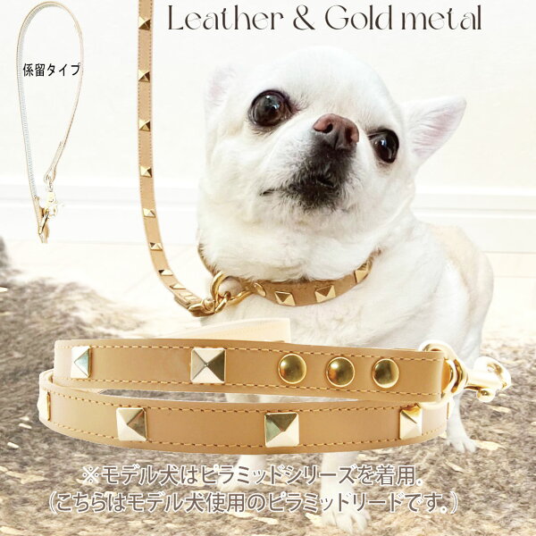商品名:ピラミッドスタッズリード Sサイズ 係留タイプ サイズ:長さ約110cm 幅1.5cm 素 材:表面:レザー(本革) 裏:プリポロピレンテープ 生産国:日本(東京下町) スタッズ、金具:ゴールド色 注意事項 係留出来るタイプですが凶暴な犬や言うことをきかない犬は絶対に使用しないで下さい。