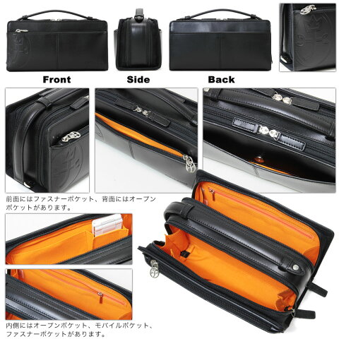内装のオレンジの布生地とヌメ革のコントラストが鮮やかなおしゃれビジネス・カジュアルシーンに対応の3方に大きく開くセカンドバッグです。